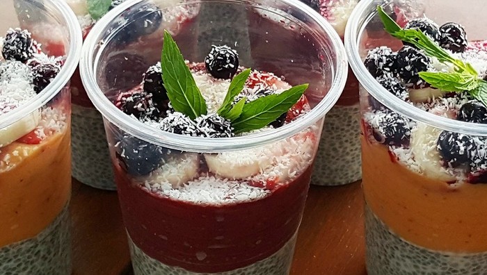 Click here to find out more about Dane’s business, Nourish & Feed; below are their awesome looking Cherry & Mango/Strawberry layered chai pudding smoothie cups!